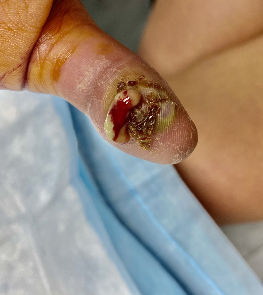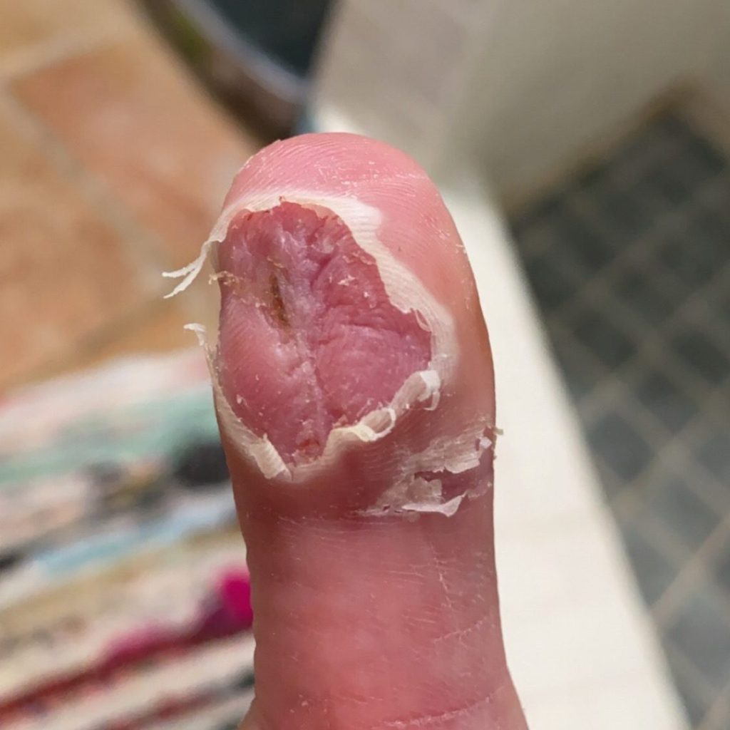About 2 days after the cleanup, my right thumb started to become swollen and sore. At first, I was blissfully ignorant. But by the end of the day the pain could no longer be ignored. By the time I woke up the next morning, my thumb pad was the size of a small grape and a white circle under the skin had appeared. Still leaving it up to “gods will,” I did nothing. Though I did express some concerns with my aunt and uncle who tried to help me pop the white circle. Go figure, we did not have any luck. And while we did sterilize the needle, I’m sure poking the hell out of it was not the best for the healing process. After that, I tried to go to the doctor, but had a very very mild case of Covid and no one would see me. Valid. So, I just lived with the four fingers on my right hand picking up the slack for another 36 hours.