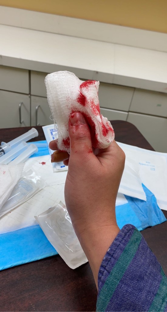 This time, I got the incredible hero, Dr. Gooth; who informed me that I was about 24 hours away from going sepsis and could possibly lose my thumb…… wtf. She cut out what she could and then referred me to an orthopedic surgeon (since my quarantine time frame was almost up.) The next day, slightly numbed but completely awake, the surgeon, Dr. Chase, cut a good majority of my thumb clear out. So. Much. Blood. It was insane. Even the nurse had to leave the room because she “hated blood and was queasy.” ????? After about 40 minutes, the doctor wrapped me up and sent me to go get the medicine he prescribed. (On my way, I got pulled over for running a red light, but was immediately let go because the officer saw me sobbing in pain. Shout out to that guy. Whatever he is doing, I hope he’s blessed.)